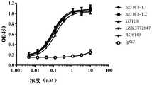 图6:通过ELISA检测在一定抗体浓度范围内人源化抗ST2抗体对IL33/ST2结合的阻断作用。图6示出人源化抗体hz31C8-1.1和hz31C8-1.2对IL33/ST2结合的阻断,嵌合抗体xi31C8,RG6149和GSK3772847的阻断作为对照示出。Figure 6: Detecting the blocking effect of humanized anti-ST2 antibody on IL33/ST2 binding within a certain antibody concentration range by ELISA. Figure 6 shows the blocking of IL33/ST2 binding by humanized antibodies hz31C8-1.1 and hz31C8-1.2, and the blocking of chimeric antibodies xi31C8, RG6149 and GSK3772847 as controls.