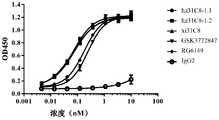 图13:通过细胞活性检测在一定抗体浓度范围内人源化抗ST2抗体在CD4+T细胞上阻断经IL33/ST2诱导的IL5分泌作用。图13示出人源化抗体hz31C8-1.1和hz31C8-1.2在CD4+T细胞上阻断经IL33/ST2诱导的IL5分泌,嵌合抗体xi31C8,RG6149和GSK3772847的阻断作为对照示出。Figure 13: Humanized anti-ST2 antibody blocked IL33/ST2 induced IL5 secretionon CD4 + T cells within a certain antibody concentration range by cell viability detection. Figure 13 shows that the humanized antibodies hz31C8-1.1 and hz31C8-1.2 block IL33/ST2 induced IL5 secretion on CD4 + T cells, and the blocking of chimeric antibodies xi31C8, RG6149 and GSK3772847 is shown as a control.