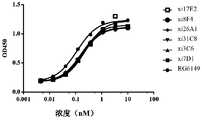 图3:通过ELISA检测在一定抗体浓度范围内嵌合抗ST2抗体对IL33/ST2结合的阻断作用。图3示出嵌合抗体xi26A1,xi7D1,xi17E2,xi31C8,xi3C6,xi8F4对IL33/ST2结合的阻断,RG6149的阻断作为对照示出。Figure 3: Detection of the blocking effect of chimeric anti-ST2 antibody on IL33/ST2 binding within a certain antibody concentration range by ELISA. Figure 3 shows the blocking of IL33/ST2 binding by chimeric antibodies xi26A1, xi7D1, xi17E2, xi31C8, xi3C6, xi8F4, and the blocking of RG6149 is shown as a control.