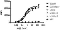 图10:通过FACS检测在一定抗体浓度范围内人源化抗ST2抗体对过表达hST2细胞的结合作用。图10示出人源化抗体hz31C8-1.1和hz31C8-1.2与过表达hST2的HEK293T-hST2-NFκB-Luciferase细胞的结合,嵌合抗体xi31C8,RG6149和GSK3772847的结合作为对照示出,IgG2的结合作为阴性对照示出。Figure 10: FACS detection of the binding effect of humanized anti-ST2 antibody to cells overexpressing hST2 within a certain antibody concentration range. Figure 10 shows the binding of humanized antibodies hz31C8-1.1 and hz31C8-1.2 to HEK293T-hST2-NFκB-Luciferase cells overexpressing hST2. The binding of chimeric antibodies xi31C8, RG6149 and GSK3772847 is shown as a control, and the binding of IgG2 is shown as The negative control is shown.