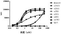 图8:通过FACS检测在一定抗体浓度范围内嵌合抗ST2抗体对过表达cyno-ST2细胞的结合作用。图8示出嵌合抗体xi31C8,xi26A1,xi7D1,xi3C6,xi8F4,xi17E2与过表达cyno-ST2的HEK293T-Cyno-ST2-NFκB-Luciferase细胞的结合,RG6149的结合作为对照示出,IgG4的结合作为阴性对照示出。Figure 8: FACS detection of the binding effect of chimeric anti-ST2 antibody on cells overexpressing cyno-ST2 within a certain antibody concentration range. Figure 8 shows the binding of chimeric antibodies xi31C8, xi26A1, xi7D1, xi3C6, xi8F4, xi17E2 to HEK293T-Cyno-ST2-NFκB-Luciferase cells overexpressing cyno-ST2, the binding of RG6149 is shown as a control, and the binding of IgG4 is shown as The negative control is shown.