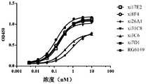 图1:通过ELISA检测在一定浓度范围内嵌合抗ST2抗体与hST2的结合。图1示出嵌合抗体xi17E2,xi8F4,xi26A1,xi31C8,xi3C6,xi7D1与hST2的结合,RG6149的结合作为对照示出。Figure 1: Detection of the binding of chimeric anti-ST2 antibody to hST2 within a certain concentration range by ELISA. Figure 1 shows the binding of chimeric antibodies xi17E2, xi8F4, xi26A1, xi31C8, xi3C6, xi7D1 to hST2, and the binding of RG6149 as a control.