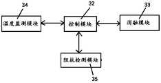 如图5所示,消融主机30包括控制模块32、消融模块33、温度监测模块34和阻抗测量模块35;控制模块32分别与温度监测模块33、消融模块34和阻抗测量模块35连接。其中,消融电极23与消融模块33连接,第一测温传感器22与温度监测模块34连接;并且,消融电极23和第一测温传感器22可以同时与阻抗测量模块35连接。As shown in FIG. 5, the