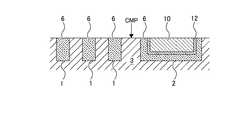 高さ調整工程は、第2金属10、シード層12、および金属間化合物6の除去レートが絶縁層3の除去レートと同じか、またはそれよりも低い除去レート選択比を持つ第3研磨液を使用して行われる。具体的には、第2配線溝2内の第2金属10、シード層12、および金属間化合物6を研磨しているときにディッシングが起こることが予想される場合には、第2金属10、シード層12、および金属間化合物6の除去レートが絶縁層3の除去レートよりも低い除去レート選択比を持つ第3研磨液が使用される。一方、第2配線溝2内の第2金属10、シード層12、および金属間化合物6を研磨しているときにディッシングが起こらないと予想される場合には、第2金属10、シード層12、および金属間化合物6の除去レートが絶縁層3の除去レートと同じ除去レート選択比を持つ第3研磨液が使用される。In the height adjusting step, a third polishing liquid having a removal rate selectivity at which the removal rate of the