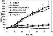 采用A549无胸腺裸鼠肿瘤模型,IdeE与KJ-Adv5腺病毒联合用药与单独KJ-Adv5病毒载体药物进行比较。6-8周龄的雌性无胸腺小鼠在右下肢区域中用0.1ml PBS中的A549肿瘤细胞(5×106)皮下接种,用于肿瘤发生。 当肿瘤达到~150mm3时,将小鼠随机分3组,6只每组。第-1天,取血,取血后腹腔注射人IVIg。注射人IVIg后30min,将蛋白酶以5mg/kg剂量静脉施用。第0天取血,用于中和抗体检测。取血后静脉注射KJ-Adv5,5×1010vp/只。每周2次测量肿瘤体积,并称重,第28天处死小鼠。实验设计如表3。Using the A549 athymic nude mouse tumor model, the combination of IdeE and KJ-Adv5 adenovirus was compared with the KJ-Adv5 viral vector drug alone.Female athymic mice aged 6-8 weeks were subcutaneously inoculated with A549 tumor cells (5×10 6 ) in 0.1 ml PBS in the right lower limb area for tumorigenesis. When the tumor reached ~150mm3 , the mice were randomly divided into 3 groups with 6 mice in each group. On day -1, blood was collected, and human IVIg was intraperitoneally injected after blood collection. 30 minutes after the injection of human IVIg, the protease was administered intravenously at a dose of 5 mg/kg. Blood was taken on
