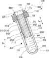 外側筒211内に挿入された内側部材212の外周面2122は、外側筒211の内周面2111に当接、又は僅かな間隔をあけて近接している。流路部材210において、外側筒211の内周面2111と内側部材212の各溝2121との間には、流路213が画成されている。流路213は、管軸方向Dsに延び、流路部材210の一端2101と他端2102とに貫通している。The outer