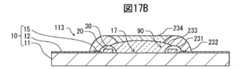 導光材233は、蛍光材料30が含有されないシリコーン樹脂等の合成樹脂であり、封止材231から出射された光を透過させながら第1領域17に伝搬する。導光材233は、基板10を平面視したときに外縁が封止材231に重畳するように、反射材232で囲まれた第1領域17に開口部90に隣接して配置される。導光材233の高さは、第1領域17の中央部が一番高く、発光領域の外縁に向かうに従って徐々に低くなるように配置される。導光材233はチクソ性が高いものが好ましい。Thelight guide material 233 is a synthetic resin such as a silicone resin that does not contain thefluorescent material 30, and propagates to thefirst region 17 while transmitting the light emitted from the sealingmaterial 231. Thelight guide material 233 is arranged adjacent to theopening 90 in thefirst region 17 surrounded by thereflective material 232 so that the outer edge thereof overlaps with the sealingmaterial 231 when thesubstrate 10 is viewed in a plan view. The height of thelight guide material 233 is arranged so as to be highest in the central portion of thefirst region 17 and gradually decrease toward the outer edge of the light emitting region. Thelight guide material 233 is preferably one having a high chixo property.