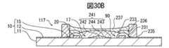 第1封止材271は、青色の光を吸収して黄色の光を出射するYAG等の蛍光体を含有するシリコーン樹脂等の合成樹脂である。第1封止材271によってLEDチップ20が封止されることによって、第1封止材271からは青色光と黄色光が混色することによって緑色光が出射される。そのために、便宜上、図33Aにおいて、第1封止材271によって封止されるLEDチップ20に、文字「G」を付している。Thefirst encapsulant 271 is a synthetic resin such as a silicone resin containing a phosphor such as YAG that absorbs blue light and emits yellow light. When theLED chip 20 is sealed by thefirst sealing material 271, green light is emitted from thefirst sealing material 271 by mixing blue light and yellow light. Therefore, for convenience, in FIG. 33A, the letter "G" is attached to theLED chip 20 sealed by thefirst sealing material 271.