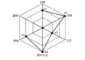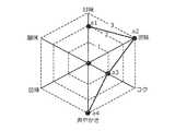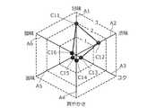 上記実施形態では、レーダーチャートが6つの軸により構成されたが、例えばX軸回りの回転に対応する軸A1および軸A2とY軸回りの回転に対応する軸A3および軸A4の4つの軸で構成されるレーダーチャートであってもよい。また、X軸、Y軸およびZ軸の各々にレーダ―チャートの軸を一つずつ対応づけてもよく、この場合、レーダ―チャートは2つの軸又は3つの軸で構成されることとなる。また、上記実施形態では、レーダーチャートを構成する複数の軸に対応する要素の入力値として1、2および3の3種類の値の何れかを入力したが、1および2の2種類の値の何れか、或いは1、2、3および4、或いは1、2、3、4、および5等の4種類以上の値の何れかを入力してもよい。すなわち、本件明細書におけるレーダーチャートとは、中心から放射状に広がっている軸の上に点を描画し、隣り合う点同士を線でつないだグラフ全般を指す。In the above embodiment, the radar chart is composed of six axes. For example, the radar chart is composed of four axes, the axis A1 and the axis A2 corresponding to the rotation around the X axis, and the axes A3 and the axis A4 corresponding to the rotation around the Y axis. It may be a configured radar chart. Further, one axis of the radar chart may be associated with each of the X-axis, the Y-axis and the Z-axis, and in this case, the radar chart is composed of two axes or three axes. Further, in the above embodiment, any one of the three types of