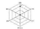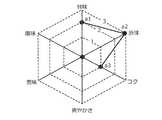 図7に示すレーダーチャートを表示装置20に表示中の端末1を基本姿勢の状態からY軸を中心に時計回りに45°回転させ、その後、基本姿勢に戻す操作をユーザが行ったとする。この操作に応じて処理装置10は、決定処理SA130にてコクの入力値a3を1に決定し、表示制御処理SA140にて、図7に示すレーダーチャートに対して入力値a3に対応する点をプロットし、更に当該入力値a3に対応する点と入力値a2に対応する点とを線分で結んで、図8に示すレーダーチャートに更新する。It is assumed that the user performs an operation of rotating the