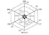 また、各カーソルが入力の暫定値を表す場合、各カーソルを線で結ぶ描画処理をカーソルの位置に応じてリアルタイムに更新してもよい。図13は、軸A1について入力値が確定し、軸A3~A6については入力がなされておらず、軸A2について入力操作中(すなわち端末1をユーザが傾けている最中)の表示画面の例を示す。また、カーソルで結ばれた図形の内側領域に色をつけてもよい。Further, in this case, as shown in FIG. 12, it is preferable to display the cursors C11 to C16 for each axis. The figure shows a state in which no input is made for any of the axes. In the example of the figure, all the cursors are shifted from the origin and displayed in consideration of visibility. One cursor that corresponds to the changed posture moves, which allows the user to easily see the axis that he or she is trying to enter. The movement of this cursor is such that the XY plane (a plane parallel to the display plane) is regarded as a horizontal plane, the acceleration is set to a predetermined fixed value (for example, gravitational acceleration), and the object (here, each cursor) moves according to the tilt angle from the horizontal plane. You may imitate the appearance of moving (rolling). That is, the larger the tilt angle, the shorter the time it takes for the cursor to move to the apex of the axis (the higher the speed). By doing so, it is possible to create an effect in which each cursor rolls on an inclined display surface.