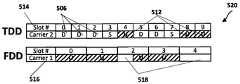 FIG. 5B illustrates the second case, with both transmit chains 420 and 422 are coupled to high band antennas on carrier 2. TDD frame 514 is on TX chain 0 420. When in case 2 of FIG. 4C, TDD frame 514 is also on TX chain 1 422. FDD frame 516 operates on TX chain 1 422 coupled to the low band carrier when case 1 is activated. As illustrated in FIG. 5B, during slots 4, 8, and 9 of TDD frame 514, frame 514 is directed on both TX chain 0 420 and TX chain 1 422 on high band, carrier 2, where UL slots 512 are active and slots 518 in FDD frame 516 are not activated. UL slots 512 support full rank transmission. However, neither case allows for TDD + TDD CA where up to two rank transmission is supported on both TDD carriers.