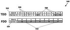 FIGs. 5A and 5B illustrate operation of the frame structures for data transmissions in configuration 430 as illustrated in FIGs. 4B and 4C. As illustrated in FIG. 5A, frame 502 is provided TX chain 0 420, carrier 2 (high band) , and frame 504 on TX chain 1 422 on carrier 1 (low band) . Frame 502 is a TDD frame while frame 504 is a FDD frame. As illustrated in TDD frame 502, the frame structure is “DDDSUDDSUU. ” UL slots 508 occur in slots 4, 8 and 9. DL slots 506 are in slots 0-2 and 5-6. FDD frame on carrier 1 illustrate all uplink slots. As is illustrated, TDD UL slots 508 in TDD frame 502 is single component carrier (CC) with one transmit chain. FDD UL slots 510 have a single rank 1 carrier.