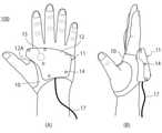 また本実施形態によれば、ユーザが装着する装着部は柔軟な素材により構成されており、またユーザの手の平側には小型の薄いサブ部を設ければよいため、ユーザは各手指を動かしたり、物を掴んだりする行為を、容易に行うことができる。Further, according to the present embodiment, the mounting portion to be worn by the user is made of a flexible material, and a small thin sub portion may be provided on the palm side of the user, so that the user can move each finger. , The act of grabbing an object can be easily performed.