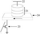 图2为现有的SOT-MRAM存储单元的结构示意图,所述SOT-MRAM存储单元包括设置在位线21和字线22之间的磁隧道结23、重金属层24以及选通晶体管25,所述磁隧道结包括层叠设置的参考层、绝缘层以及自由层。当所述选通晶体管25开启时,使所述磁隧道结23导通,产生流过所述重金属层24的电流。由于自旋霍尔效应,流过所述重金属层24的电流产生两个方向相反的极化电流。自旋极化电子在所述重金属层24的边缘堆积,产生自旋流注入所述自由层。在外加磁场的作用下,自旋流对所述自由层和所述参考层中的磁化产生力矩,诱导所述自由层和所述参考层发生确定性的磁化翻转。当所述自由层的磁化方向与所述参考层的磁化方向相同时,所述磁隧道结23呈现低阻态,对应写入二进制数据“0”;当所述自由层的磁化方向与所述参考层的磁化方向相反时,所述磁隧道结23呈现高阻态,对应写入二进制数据“1”。对于所述SOT-MRAM存储单元,外加磁场的引入增加了电路复杂度和可靠性风险,无法有效微缩集成,也降低了所述自由层和所述参考层的稳定性,成为限制自旋轨道矩应用的最大障碍。2 is a schematic structural diagram of an existing SOT-MRAM memory cell. The SOT-MRAM memory cell includes a
