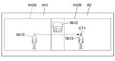 例えば、図5Bに示すように、実空間A1内の定位置に背景として表示させたい第2オブジェクトOb22(例えば建物)と、実空間A1内を左から右へと移動させたい第2オブジェクトOb23(例えば人)とを含む第3画像Im3Aをプロジェクタ30にて投影させる場合、制御システム10は、まず、仮想空間A2上で、第2オブジェクトOb22に対応する第1オブジェクトOb12が定位置に存在し、第2オブジェクトOb23に対応する第1オブジェクトOb13が左側の出発地点に存在するような第1画像Im1(図5A参照)を生成する。制御システム10は、この第1画像Im1を仮想設置位置P2を視点として所定のレンダリング領域でレンダリングした第2画像Im2Aを生成し、第2画像Im2Aに基づく第3画像Im3Aをプロジェクタ30にて実空間A1に投影させる。なお、制御システム10は、移動する第1オブジェクトOb13が画像中心CT1に位置するように第2画像Im2Aを生成する。その後、制御システム10は、仮想空間A2上で、第1オブジェクトOb12は定位置に存在し、第1オブジェクトOb13が徐々に右側に移動するような第1画像Im1(動画)を作成しつつ、画像中心CT1に第1オブジェクトOb13が位置するように第2画像Im2A(動画)をレンダリングする。For example, as shown in FIG. 5B, a second object Ob22 (for example, a building) to be displayed as a background at a fixed position in the real space A1 and a second object Ob23 (for example, a building) to be moved from left to right in the real space A1. For example, when the third image Im3A including a person) is projected by the