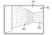 第1画像生成ステップでは、実空間A1内の第1位置P5(図20に点線で示した第2オブジェクトOb6の位置)に対応する仮想空間A2内の第2位置P6(図19に示す位置)に第1オブジェクトOb5が表示される第1画像Im1を生成する。第1調整画像生成ステップでは、第1画像Im1から第2画像Im2として、第1オブジェクトOb5が画像中心CT1に対して第1方向(例えばパン方向の一方である右方向)に位置する第1調整画像Im21(図19参照)をレンダリングする。In the first image generation step, the second position P6 (position shown in FIG. 19) in the virtual space A2 corresponding to the first position P5 (position of the second object Ob6 shown by the dotted line in FIG. 20) in the real space A1. The first image Im1 in which the first object Ob5 is displayed is generated. In the first adjustment image generation step, as the first image Im1 to the second image Im2, the first object Ob5 is positioned in the first direction (for example, the right direction which is one of the pan directions) with respect to the image center CT1. Image Im21 (see FIG. 19) is rendered.