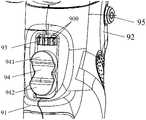 如图16A-16B、图18A-18B所示,所示,主体部分4包括手柄9,摆头控制开关为拨盘93开关,拨盘93开关包括设置于手柄9表面上的拨盘93,拨盘93配置为可被朝向第一拨动方向拨动以驱动末端执行器1朝向第一摆动方向摆动,且配置为可被朝向第二拨动方向拨动以驱动末端执行器1朝向第二摆动方向摆动,第一拨动方向与第二拨动方向不同。As shown in FIGS. 16A-16B and 18A-18B, as shown, themain body part 4 includes ahandle 9, the head swing control switch is adial 93 switch, and thedial 93 switch includes adial 93 arranged on the surface of thehandle 9. Thedisc 93 is configured to be toggled toward the first toggle direction to drive theend effector 1 to swing toward the first swing direction, and configured to be toggled toward the second toggle direction to drive theend effector 1 to swing toward the second swing direction The direction swings, and the first toggle direction is different from the second toggle direction.