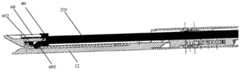 如图12E所示,例如,端部突起611的突出于弹性连接杆610的端面为弧形面612,出刀驱动结构602和弹性连接件构造为:在出刀驱动力的作用下出刀驱动结构602沿轴向远离末端执行器1的第二端移动而到达端部突起611时,出刀驱动结构602的第二端抵靠弧形面以使弹性连接杆610在第二方向上发生弹性形变,在出刀驱动力的作用下出刀驱动结构602继续沿轴向远离末端执行器1的第二端移动而使得嵌套孔604与端部突起611相对时,在弹性连接杆610的弹性回复力的作用下端部突起611沿第二方向朝嵌套孔604移动并嵌入嵌套孔604中以使推钉驱动机构40(即切割驱动机构)与推钉滑块60(即携刀部件)连接。这种设计能够充分利用出刀驱动结构602这一部件,在利用其实现驱动切割刀605露出以对目标组织进行切割的同时,还能够快速与推钉驱动机构40连接,以为接下来的切割阶段驱动切割刀605移动而进行切割做准备,且结构简单,易于实现,并且节约空间。As shown in FIG. 12E , for example, the end surface of theend protrusion 611 protruding from the elastic connectingrod 610 is an arc-shapedsurface 612 , and theknife driving structure 602 and the elastic connecting piece are configured to drive the knife under the action of the knife driving force. When thestructure 602 moves away from the second end of theend effector 1 in the axial direction and reaches theend protrusion 611, the second end of theknife driving structure 602 abuts against the arc surface to make the elastic connectingrod 610 elastic in the second direction Deformation, under the action of the driving force of the knife, the knife-exit driving structure 602 continues to move away from the second end of theend effector 1 in the axial direction so that thenesting hole 604 is opposite to theend protrusion 611, the elasticity of the elastic connectingrod 610 Under the action of the restoring force, theend protrusion 611 moves toward thenesting hole 604 in the second direction and is inserted into thenesting hole 604, so that the nail pushing driving mechanism 40 (ie the cutting drive mechanism) and the nail pushing slider 60 (ie the knife-carrying member) connect. This design can make full use of the part of theknife driving structure 602 , which can be used to drive the cuttingknife 605 to be exposed to cut the target tissue, and at the same time, it can also be quickly connected to the pushnail driving mechanism 40 for the next cutting stage. Thecutting blade 605 is driven to move to prepare for cutting, and the structure is simple, easy to implement, and saves space.