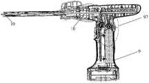 例如,在拨盘93配置为可朝向第一旋转方向或第二旋转方向按档位旋转时,拨盘93朝向第一拨动方向每旋转一个档位,电动马达正向旋转一个档位以驱动后摆动驱动构件82沿轴向远离手柄9移动一个档位的距离以使末端执行器1朝向第一摆动方向转动一个档位的角度;拨盘93朝向第二拨动方向每旋转一个档位,电动马达反向旋转一个档位以驱动后摆动驱动构件82沿轴向靠近手柄9移动一个档位的距离以使末端执行器1朝向第二摆动方向转动一个档位的角度,从而可通过操作手柄9上的拨盘93实现方便地控制电动马达转动的方向和档位,从而控制后摆动驱动构件82的移动,以控制末端执行器1摆动的角度,操作简便。For example, when thedial 93 is configured to rotate by gears toward the first rotation direction or the second rotation direction, every time thedial 93 rotates toward the first rotation direction by one gear, the electric motor rotates forwardly by one gear to drive The rearswing driving member 82 moves away from thehandle 9 in the axial direction by a distance of one gear to make theend effector 1 rotate by one gear in the first swing direction; each time thedial 93 rotates in the second swing direction by one gear, The electric motor reversely rotates one gear to drive the rearswing drive member 82 to move axially close to thehandle 9 by one gear to rotate theend effector 1 toward the second swing direction by one gear, so that the handle can be operated by Thedial 93 on the 9 realizes convenient control of the rotation direction and gear of the electric motor, thereby controlling the movement of the rearswing driving member 82 to control the swing angle of theend effector 1, and the operation is simple and convenient.