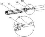 当然,在其他实施例中,也可以是推钉与切割互相独立,即推钉滑块60不复用作携刀部件。即切割装置包括携刀部件和切割刀605;切割刀605与携刀部件活动连接,携刀部件移动以使切割刀605移动;在推钉阶段,切割装置以及切割驱动机构位于末端执行器1的第一端;在切割阶段,切割驱动机构驱动切割装置从第一端移动至第二端以对目标组织沿从第一端到第二端的方向进行切割,携刀部件与推钉滑块60彼此独立,切割驱动机构与推钉驱动机构40彼此独立。Of course, in other embodiments, the nail pushing and cutting may be independent of each other, that is, thenail pushing slider 60 is no longer used as a knife-carrying member. That is, the cutting device includes a knife-carrying part and a cuttingknife 605; the cuttingknife 605 is movably connected with the knife-carrying part, and the knife-carrying part moves to move the cuttingknife 605; The first end; in the cutting stage, the cutting drive mechanism drives the cutting device to move from the first end to the second end to cut the target tissue along the direction from the first end to the second end, and the knife-carrying member and thenail pushing slider 60 are mutually Independent, the cutting drive mechanism and the nail pushingdrive mechanism 40 are independent of each other.