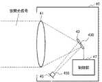 制御部47は、液晶レンズ43の入射面に入射された光信号が、受光素子45の受光部450の配置された位置(所定領域)に向けて出射されるように、液晶レンズ43を制御する。例えば、制御部47は、プロセッサとメモリを含むマイクロコンピュータによって実現される。例えば、制御部47は、液晶レンズ43の反射面に電圧を印可される電圧を制御することによって、液晶レンズ43の所望の位置にレンズ領域430を形成する。制御部47は、液晶レンズ43の反射面に印可する電圧を調節することによって、レンズ領域430の屈折率を変化させる。レンズ領域430の屈折率を変化させれば、液晶レンズ43に入射された空間光信号は、レンズ領域430の屈折率に応じて適宜回折される。すなわち、液晶レンズ43に入射された空間光信号は、レンズ領域430の光学的特性に応じて回折される。例えば、制御部47は、所望の焦点距離に空間光信号を集光するための仮想レンズ画像を、液晶レンズ43の反射面に表示させる。なお、制御部47による液晶レンズ43の駆動方法はここで挙げた限りではない。The