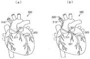 図1(a)に示すように、心臓300の経皮的冠動脈形成術治療(PCI治療)では、ガイディングカテーテル310の先端部311を冠動脈入口部301に配置する。処置用のカテーテルを冠動脈入口部301から遠位にある病変部303に到達させるためのバックサポートを強化するために、図1(b)に示すように、ガイディングカテーテル310の内腔内にガイドエクステンションカテーテル320を挿入する。そして、ガイドエクステンションカテーテル320の先端部321を、ガイディングカテーテル310の先端を越えて遠位方向に(病変部303に向けて)突出させる。FIGS. 1(a) and 1(b) are schematic diagrams showing an example of percutaneous coronary angioplasty treatment. (a) shows a state in which a guiding catheter is placed, and (b) shows a state in which a guide extension catheter is further placed.