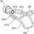 如图8所示,在自然状态下,弯曲节段1211向第一方向弯曲,并且,弯曲节段1211的弯曲使得弯曲节段1211的远离延伸节段1212的一端与延伸节段1212不在同一平面内,使得两个夹合臂120的自由端远离轴向中心轴线I-I,即两个夹合臂120的两个连接段122远离轴向中心轴线I-I而呈相互远离的状态,使得夹合臂120的打开较为方便。第一方向,例如,如图8所示,可以为远离另一个夹合臂120的连接段122的方向,且弯曲节段1211的远离延伸节段1212的一端与延伸节段1212不在同一平面内。As shown in FIG. 8 , in the natural state, the