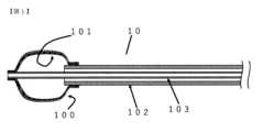 2.24mm、長さ3mm;ステンレス鋼製)を用意し、アラミド繊維(長さが1200mm、直径が0.3mm)の端部を段差付のパイプの段差に巻き付けて固定し、アラミド繊維をブレードチューブに貫通後、段差付のパイプの太径部とブレードチューブ先端部とを接着剤(東亞合成株式会社製、シアノアクリレート系)により固定することで、外筒シャフト102を作製した。Next, a one-stage stepped pipe having a small diameter portion on the distal end side and a large diameter portion on the proximal end side (the small diameter portion has an outer diameter of 2 mm, an inner diameter of 1.84 mm, and a length of 7 mm, A large diameter part has an outer diameter of 2.4 mm, an inner diameter of 2.24 mm, a length of 3 mm; stainless steel) is prepared, and the end of the aramid fiber (length of 1200 mm, diameter of 0.3 mm) is attached to a stepped pipe After fixing by wrapping around the step, aramid fiber is passed through the blade tube, and the large diameter part of the stepped pipe and the tip of the blade tube are fixed with an adhesive (manufactured by Toagosei Co., Ltd., cyanoacrylate), An outer