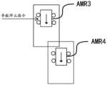 具体来说,假设可移动设备AMR3和AMR4的动态安全区域相互重叠。假设AMR3和AMR4的位置关系如图4所示。在图4中,箭头方向标识可移动设备的行驶方向。可见,AMR3和AMR4处于同一行驶方向上,并且AMR4在该 行驶方向上的位置更靠前,因此AMR4的行驶优先级高于AMR3的行驶优先级。进而,在图4中,调度系统基于AMR3和AMR4的行驶优先级,向AMR3下发导航停止指令。Specifically, it is assumed that the dynamic security areas of the mobile devices AMR3 and AMR4 overlap each other. Assume that the positional relationship between AMR3 and AMR4 is shown in Figure 4. In FIG. 4 , the direction of the arrow identifies the traveling direction of the mobile device. It can be seen that AMR3 and AMR4 are in the same driving direction, and the position of AMR4 in this driving direction is more forward, so the driving priority of AMR4 is higher than that of AMR3. Furthermore, in FIG. 4 , the dispatching system issues a navigation stop instruction to AMR3 based on the driving priorities of AMR3 and AMR4.