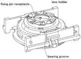 It should be noted that the fixing-side pin can not only rotate but also slide (or translate) in the fixing-side pin receptacle having an elongate shape. Thus, the fixing-side pin is not fixed to the lens holder. The terms "fixing-side pin" and "moving-side pin" are only names for distinction broadly indicating that the fixing-side pin is relatively immovable as compared with the moving-side pin, which moves with the rotating variable aperture frame. The term "fixing-side pin" merely refers to the side at which to (more or less, not completely) fix the blade to the lens holder. The fixing-side pin and the moving-side pin may alternatively be simply called a "first pin" and a "second pin. " Similarly, the fixing-side pin receptacle and the moving-side pin receptacle may alternatively be simply called a "first pin receptacle" and a "second pin receptacle. "