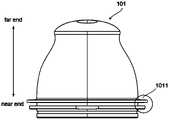Fig. 2a is a schematic diagram of the external structure of the housing in an embodiment of the invention, and Fig. 2b is a schematic diagram of the protective cover. Protective cover 102 comprises outer cover 1021, clamp 1022 and inner cover 1023. The outer cover 1021 is provided with a second opening in the far end which faces the first opening. At the second opening, the outer cover 1021 is connected to the clamp 1022 by a breakable column 10211, which is distributed between the outer cover 1021 and the clamp 1022 at regular intervals. Column 10211 can be broken when the outer cover 1021 rotates relative to the clamp 1022, and the outer cover 1021 is separated from the clamp 1022.