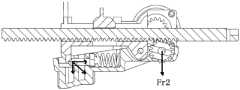 如图2-9所示,提供一种电动吻合器过载保护结构,其适用于电动吻合器中。通过在吻合器中设置过载切换装置,使得在切割组织过程中,遇到较厚的组织或其它情况造成阻力过大,造成驱动齿条与过渡齿轮之间推力过大时,可以通过偏转壳体和偏压组件的配合设计,有效将过渡齿轮与驱动齿条脱离,实现电动吻合器在遇到加载力过大时自动脱开,避免对器械破坏以及防止对人体造成意外伤害,且结构稳定可靠。As shown in Fig. 2-9, an electric stapler overload protection structure is provided, which is suitable for electric staplers. By setting the overload switching device in the stapler, in the process of cutting tissue, when encountering thicker tissue or other conditions that cause excessive resistance, resulting in excessive thrust between the drive rack and the transition gear, it can pass through the deflection housing The coordinated design with the bias component can effectively separate the transition gear from the driving rack, realize the automatic disengagement of the electric stapler when the loading force is too large, avoid damage to the instrument and prevent accidental injury to the human body, and the structure is stable and reliable .