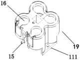 为了使得电源安装壳体18与电路连接座26能够精确定位,本实施例中,电源安装壳体18的底部设有定位销15,电路连接座26上设有与定位销15插接配合的定位孔271,两者配合插接后能够实现定位连接,并且此时,导电片组件25也能够与连接底座27的插槽相对应。具体地,导电片组件25还包括用于将不同电池安装腔16内的电池电连接的电池连接导片143,其分别在第一壳体19的一侧设置有连接上方两个电池的横向的电池连接导片143,以及在第二壳体另一侧的两个分别连接上下电池的连接导片143,从而使得四个电池放置在电池安装腔16内后能够形成串联回路。具体地,电池安装腔16数量为四个,四个电池安装腔16上下均设有两个,第一壳体19的下部对应两个电池安装腔16开口处,分别设有正极导电片141和负极导电片142,第一壳体19的上部对应电池安装腔16开口处横向设有一个电池连接导片143。In order to enable the power