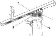 具体地,本实施例中的吻合器驱动装置包括驱动组件、开关控制组件以及安全控制组件,其中,驱动组件用于驱动吻合器的执行组件8,驱动组件包括驱动齿条1和用于驱动驱动齿条1的驱动电机9;作为一种优选的实施例,本实施例中,驱动电机9对驱动齿条1驱动的具体方式为驱动组件还包括驱动齿轮2和过渡齿轮3,驱动齿轮2与驱动电机9输出轴驱动连接,过渡齿轮3同时与驱动齿轮2以及驱动齿条1啮合。Specifically, the stapler drive device in this embodiment includes a drive assembly, a switch control assembly, and a safety control assembly, wherein the drive assembly is used to drive the