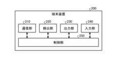 また、端末装置200は、検出信号を検出した場合、車両1によって歩行者が検出されたことを示す検出通知を出力する。例えば、端末装置200は、スピーカーを備え、スピーカーから検出通知に対応する音を出力する。あるいは、端末装置200は、振動機能(バイブレーション機能ともいう)を備え、検出通知に対応する振動を出力してもよい。Further, when the