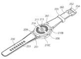 결착 부재(250, 260)는 락킹 부재(251, 261)를 이용하여 하우징(210)의 적어도 일부 영역에 탈착 가능하도록 결착될 수 있다. 결착 부재(250, 260)는 고정 부재(252), 고정 부재 체결 홀(253), 밴드 가이드 부재(254), 밴드 고정 고리(255) 중 하나 또는 그 이상을 포함할 수 있다.The binding