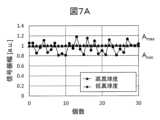 図7Aは、本発明の粒子計測装置を用いて真球度の高い粒子と低い粒子からの反射光を繰り返し取得した際に予想される結果の模式図である。真球度の高い粒子の信号振幅はほぼ一定であるのに対して、真球度の低い粒子の信号振幅は図7に示すようにばらつくことが予想される。本発明においては、粒子の真球度を表すパラメータεを以下の式で定義することとした。式におけるAmin、Amaxは、それぞれ繰り返し取得した粒子からの反射信号振幅Aの最小値と最大値である。FIG. 7A is a schematic diagram of expected results when reflected light from particles with high sphericity and particles with low sphericity are repeatedly acquired using the particle measuring device of the present invention. While the signal amplitude of particles with high sphericity is almost constant, the signal amplitude of particles with low sphericity is expected to vary as shown in FIG. In the present invention, the parameter ε representing the sphericity of particles is defined by the following equation. Amin and Amax in the equation are the minimum and maximum values of the reflected signal amplitude A from the particles repeatedly acquired, respectively.
