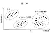 図8は、本発明の粒子計測装置を用いて凝集体とシリコンオイルの液滴の混合サンプルを測定し、平均信号振幅Aave(あるいは粒径)と真球度パラメータεに対して粒子をプロットした際に期待される結果の例である。真球度の低い領域にタンパク質の凝集体が分布し、真球度の高い領域にシリコンオイルの液滴が分布するので、粒径を計測すると同時に両者を区別することが可能になる。FIG. 8 shows an example of the results expected when measuring a mixed sample of aggregates and silicone oil droplets using the particle measuring device of the present invention and plotting the particles against the average signal amplitude Aave (or particle size) and the sphericity parameter ε. Since protein aggregates are distributed in regions with low sphericity and droplets of silicone oil are distributed in regions with high sphericity, it is possible to measure the particle size and distinguish between the two.