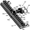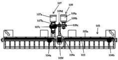 继续如图3a和图7所示,换档结构105上设有沿平行于主轴103的轴线方向的方向布置的齿条105a。当换档结构105处于第一位置时,蜗杆104a和蜗杆104b与齿条105a啮合,此时通过第二动力机构109的驱动将使得蜗杆104a借助于齿条105a改变蜗杆104a和104b在主轴103上的位置,从而实现对于不同的输出单元111a、111b、111c、111d、111e、111f、111g、111h、111i、111j的选择,进而实现对于不同的移相器的选择。此时,涡轮104a和涡轮104b并不与其上方的斜齿轮1130a-1130j啮合。相应地,当换档结构105处于与第一位置不同的第二位置时,蜗杆104a和蜗杆104b不与齿条105a啮合而与其上方的斜齿轮1130a-1130j啮合,此时通过第二动 力机构109的驱动将使得蜗杆104a借助于其上方的斜齿轮1130a-1130j啮合传动至相应的输出单元111a、111b、111c、111d、111e、111f、111g、111h、111i、111j,进而实现对于相应的移相器的驱动。As shown in FIGS. 3 a and 7 , the shifting
