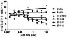 从健康志愿者PBMC中分离得到CD4+T细胞。候选拮抗型抗体,200nM,5倍稀释9个梯度,加入200U/mL IL-2及20ng/mL重组人TNF-alpha。加入CD4+T细胞,2×105个/孔,37℃孵育72小时。PE-anti-CD25(1:50)和Alexa Fluor 488-anti-Foxp3(1:50)进行染色,使用BD FACS Canto II流式细胞仪计数分析。根据实验结果显示6条抗体均具有优异的Treg细胞增殖抑制能力。其中表4结果如图3所示,表5中的结果如图4所示。CD4+ T cells were isolated from PBMC of healthy volunteers. Candidate antagonistic antibody, 200nM, 5-fold diluted 9 gradients, added 200U/mL IL-2 and 20ng/mL recombinant human TNF-alpha. Add CD4+ T cells, 2×105 cells/well, and incubate at 37°C for 72 hours. PE-anti-CD25 (1:50) and Alexa Fluor 488-anti-Foxp3 (1:50) were used for staining, and BD FACS Canto II flow cytometer was used for counting analysis. According to the experimental results, the six antibodies all have excellent ability to inhibit the proliferation of Treg cells. The results in Table 4 are shown in Figure 3, and the results in Table 5 are shown in Figure 4.