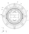補強部材13は、Z方向に厚みを持つ部材である。補強部材13は、様々な形状を取り得るが、この実施形態では、例えば図3のように、1個の環状部分と、環状部分の中心から環状部分に向けて放射状に延びる複数の放射状部分とを有する。さらに、複数の放射状部分は、環状部分の中心から環状部分に向けて放射状に延びる4個の内側放射状部分と、環状部分から外側に向けて放射状に延びる8個の外側放射状部分とを有する。The reinforcing