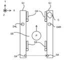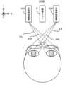 同様に、第2照明I2に含まれる要素照明EI21は、第1要素領域ER1に向けて、第2光L2の一部を構成する要素光ELである第1要素光EL21を照射する。また、第2照明I2に含まれる要素照明EI22は、要素照明EI21よりも所定方向に交差する交差方向に沿った一方側に位置する。要素照明EI22は、第2要素領域ER2に向けて、第2光L2の一部を構成する第2要素光EL22を照射する。また、第2照明I2に含まれる要素照明EI23は、要素照明EI22よりも所定方向に交差する交差方向に沿った一方側に位置する。要素照明EI23は、第3要素領域ER3に向けて、第2光L2の一部を構成する第3要素光EL23を照射する。すなわち、図8は、要素照明EI22は、要素照明EI21よりX軸方向に沿った+X側に位置し、第1要素領域ER1よりX軸方向に沿った-X側に位置する第2要素領域ER2に向けて第2要素光EL22を照射する例を示している。また、要素照明EI23は、要素照明EI22よりX軸方向に沿った+X側に位置し、第2要素領域ER2よりX軸方向に沿った-X側に位置する第3要素領域ER3に向けて第3要素光EL23を照射する例を示している。Similarly, the elemental illumination EI21 included in the second illumination I2 irradiates the first elemental light EL21, which is the elemental light EL forming part of the second light L2, toward the first elemental region ER1. Further, the element illumination EI22 included in the second illumination I2 is located on one side of the element illumination EI21 along the intersecting direction intersecting the predetermined direction. The element illumination EI22 irradiates the second element light EL22, which constitutes a part of the second light L2, toward the second element region ER2. Further, the element illumination EI23 included in the second illumination I2 is located on one side of the element illumination EI22 along the intersecting direction intersecting the predetermined direction. The element illumination EI23 irradiates the third element light EL23, which constitutes a part of the second light L2, toward the third element region ER3. That is, in FIG. 8, the element illumination EI22 is located on the +X side along the X-axis direction from the element illumination EI21, and the second element region ER2 is located on the −X side along the X-axis direction from the first element region ER1. An example is shown in which the second element light EL22 is irradiated toward. Further, the element illumination EI23 is located on the +X side along the X-axis direction from the element illumination EI22, and toward the third element region ER3 located on the −X side along the X-axis direction from the second element region ER2. An example is shown in which the three-element light EL23 is irradiated.