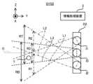 [1-2:情報処理装置1の構成]The illumination device D1 includes a first illumination I1 and a second illumination I2. The first illumination I1 irradiates the first light L1 as the light L toward the first region R1. The second illumination I2 directs the second light L2 toward a second region R2 located on one side along the predetermined direction from the first illumination I1 and on the other side along the predetermined direction from the first region R1. is irradiated as light L. FIG. 1 shows an example in which the "predetermined direction" is the Z-axis direction, the "one side" is the -Z side, and the "other side" is the +Z side. That is, in FIG. 1, the second illumination I2 is located on the -Z side along the Z-axis direction from the first illumination I1, and the second area is located on the +Z side along the Z-axis direction from the first area R1. An example is shown in which the second light L2 is irradiated toward R2.