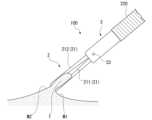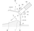 なお、一対のアーム21が通常形態であるとき、必ずしも一対のアーム21の正面方向Fがシース220の長手軸方向Lに沿う必要はない。一対のアーム21の正面方向Fがシース220の長手軸方向Lに沿わないように、第一アーム211と第二アーム212とは独立して回動してもよい。The normal form (first form) is an operating form in which the