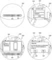 발광 모듈(미도시)은, 적어도 하나의 발광 소자를 포함할 수 있다. 발광 모듈은, 웨어러블 장치(103)의 특정 상태에 관한 정보를 사용자에게 시각적으로 제공하기 위하여, 특정 상태에 대응되는 색상의 빛을 방출하거나, 특정 상태에 대응되는 동작으로 빛을 방출할 수 있다. 예를 들면, 웨어러블 장치(103)가, 충전이 필요한 경우, 적색 광의 빛을 일정한 주기로 방출할 수 있다. 일 실시예에서, 발광 모듈은, 제1 림(201) 및/또는 제2 림(202) 상에 배치될 수 있다.The light-emitting module (not shown) may include at least one light-emitting element. The light-emitting module may emit light of a color corresponding to a specific state or emit light with an action corresponding to a specific state in order to visually provide information about a specific state of the wearable device (103) to the user. For example, when the wearable device (103) needs to be charged, it may emit red light at a regular cycle. In one embodiment, the light-emitting module may be disposed on the first rim (201) and/or the second rim (202).
