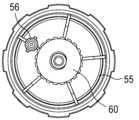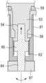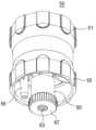 그리고 하단몸체부(55)는 도 24 내지 도 26에 도시된 바와 같이, 상단몸체부(51) 사이에서 도 22 및 도 23에 도시된 가스켓이 게재된 상태에서 결합되어 진다. 후에 설명되는 바와 같이, 하단몸체부(55)는 해제모드시에는 회동이 가능하여 배출공(52)의 개폐 및 개구비를 조절할 수 있으며, 잠금모드시에는 회동이 제한되게 된다.And the lower body part (55) is joined with the upper body part (51) in a state where the gasket shown in FIGS. 22 and 23 is placed between them, as shown in FIGS. 24 to 26. As described later, the lower body part (55) can rotate in the release mode to adjust the opening/closing and opening ratio of the discharge hole (52), and the rotation is restricted in the lock mode.