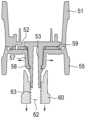 중심부재(64)는 하단홀(62)에 게재되며 외면의 나사산(66)이 내부나사산(63)과 나사결합되는 걸림단(65)을 갖도록 구성된다. 그리고 이러한 중심부재를 회전시키기 위한 레버(67)를 포함한다.The central member (64) is mounted in the lower hole (62) and is configured to have a catch (65) in which the screw threads (66) on the outer surface are screw-connected with the internal screw threads (63). In addition, it includes a lever (67) for rotating the central member.