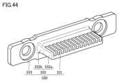 図44は、ゲーム装置の舌体の構成を示す斜視模式図である。図44に示されるように、ゲーム装置3は、舌体332を有している。舌体332は、ゲーム装置側凹み310に設けられる。舌体332は、第1ゲームコントローラ1の第1開口170に挿入される。舌体332は、本体第1端子331を有している。本体第1端子331は、ゲームコントローラ端子(第1端子160)と電気的に接続されるゲーム装置端子である。Figure 44 is a perspective schematic diagram showing the configuration of the tongue body of the game device. As shown in Figure 44, thegame device 3 has atongue body 332. Thetongue body 332 is provided in agame device recess 310. Thetongue body 332 is inserted into thefirst opening 170 of thefirst game controller 1. Thetongue body 332 has a main bodyfirst terminal 331. The main body first terminal 331 is a game device terminal that is electrically connected to the game controller terminal (first terminal 160).