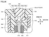 図26は、図24のXXVI-XXVI線に沿った断面模式図である。なお、各弾性部材片における断面についても実質的に同様の構造であるため、以下では特に左右を区別せずに説明する。図26に示されるように、前グリップハウジング531には、弾性部材配置孔510が設けられている。弾性部材501は、弾性部材配置孔510に配置される。弾性部材501は、弾性部材本体501cと、第1突出部501dと、第2突出部501eとを有している。弾性部材本体501cは、前後方向に延びている。第1突出部501dは、弾性部材本体501cから前後方向に対して垂直な方向の一方側に突出している。第2突出部501eは、弾性部材本体501cから前後方向に対して垂直な方向の他方側に突出している。FIG. 26 is a schematic cross-sectional view taken along line XXVI-XXVI in FIG. 24. Note that the cross sections of each elastic member piece are substantially the same structure, and therefore the following description will not distinguish between left and right. As shown in FIG. 26, thefront grip housing 531 is provided with an elasticmember arrangement hole 510. Theelastic member 501 is arranged in the elasticmember arrangement hole 510. Theelastic member 501 has an elastic membermain body 501c, afirst protrusion 501d, and asecond protrusion 501e. The elastic membermain body 501c extends in the front-rear direction. Thefirst protrusion 501d protrudes from the elastic membermain body 501c to one side in a direction perpendicular to the front-rear direction. Thesecond protrusion 501e protrudes from the elastic membermain body 501c to the other side in a direction perpendicular to the front-rear direction.